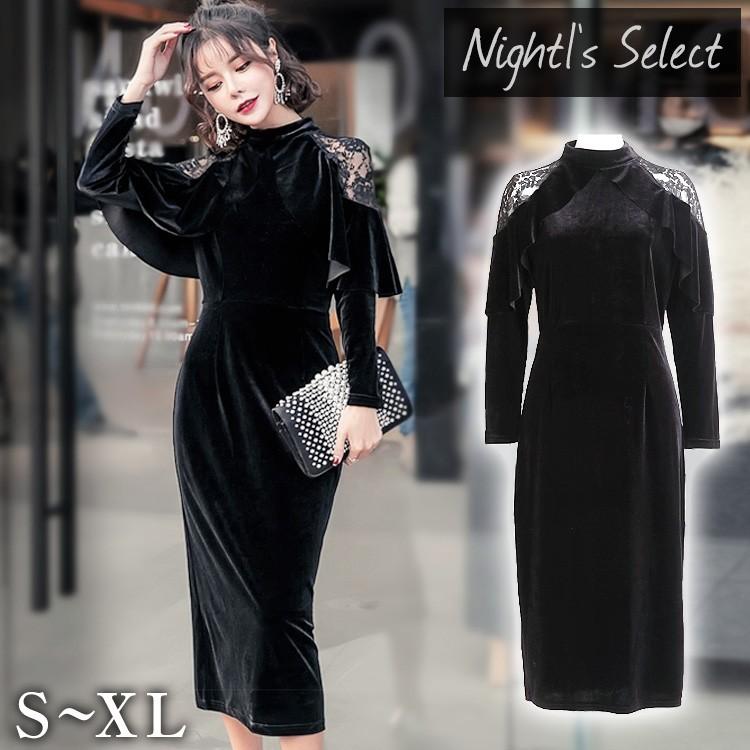 セレモニー ワンピース 結婚式 ドレス ロング丈 袖あり 大きいサイズ 長袖 冬 秋冬 ミモレ丈 膝下丈 ベルベット タイト 代 30代 40代 ブラック 黒 3603 パーティードレス通販ナイトワン 通販 Yahoo ショッピング